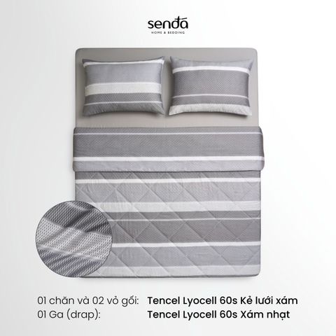 Bộ chăn ga gối 4 món (chăn chần bông) Lụa Tencel 60S họa tiết - Kẻ lưới xám