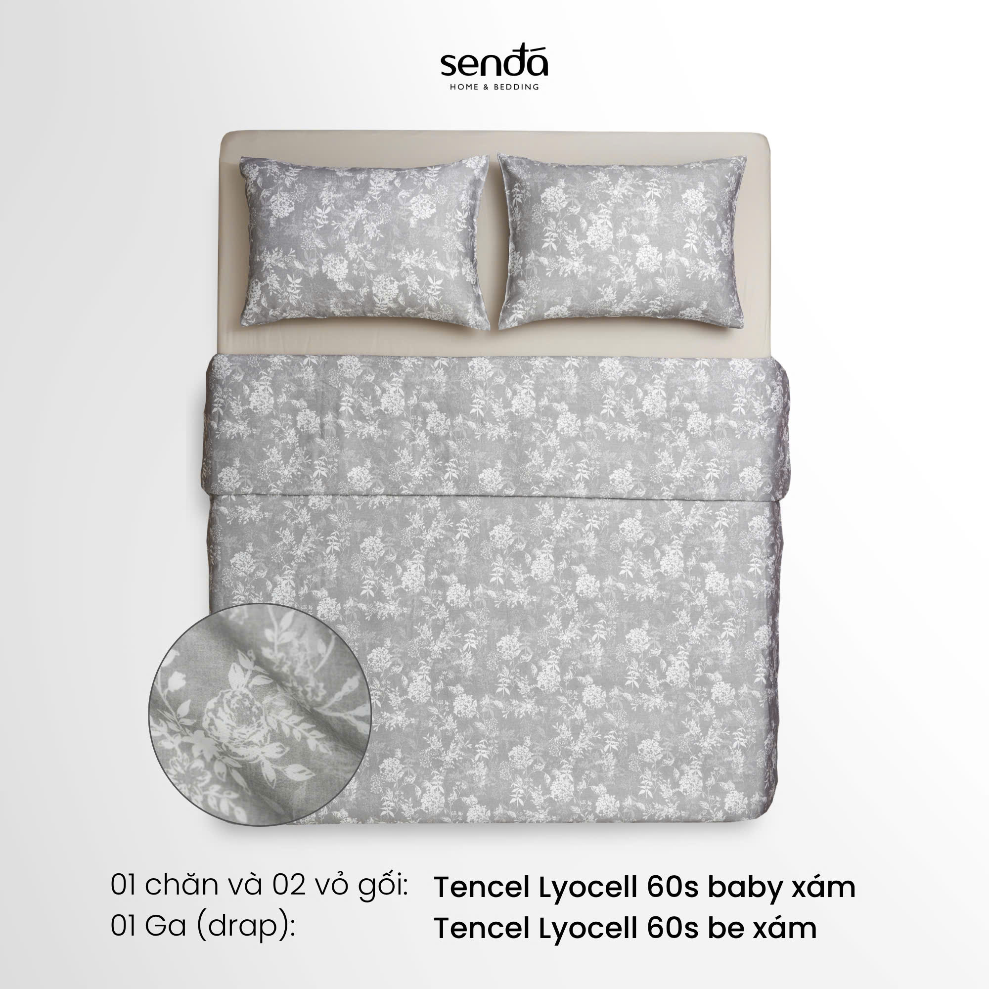 Bộ chăn ga gối 4 món (chăn chần bông) Lụa Tencel 60S họa tiết - Baby xám