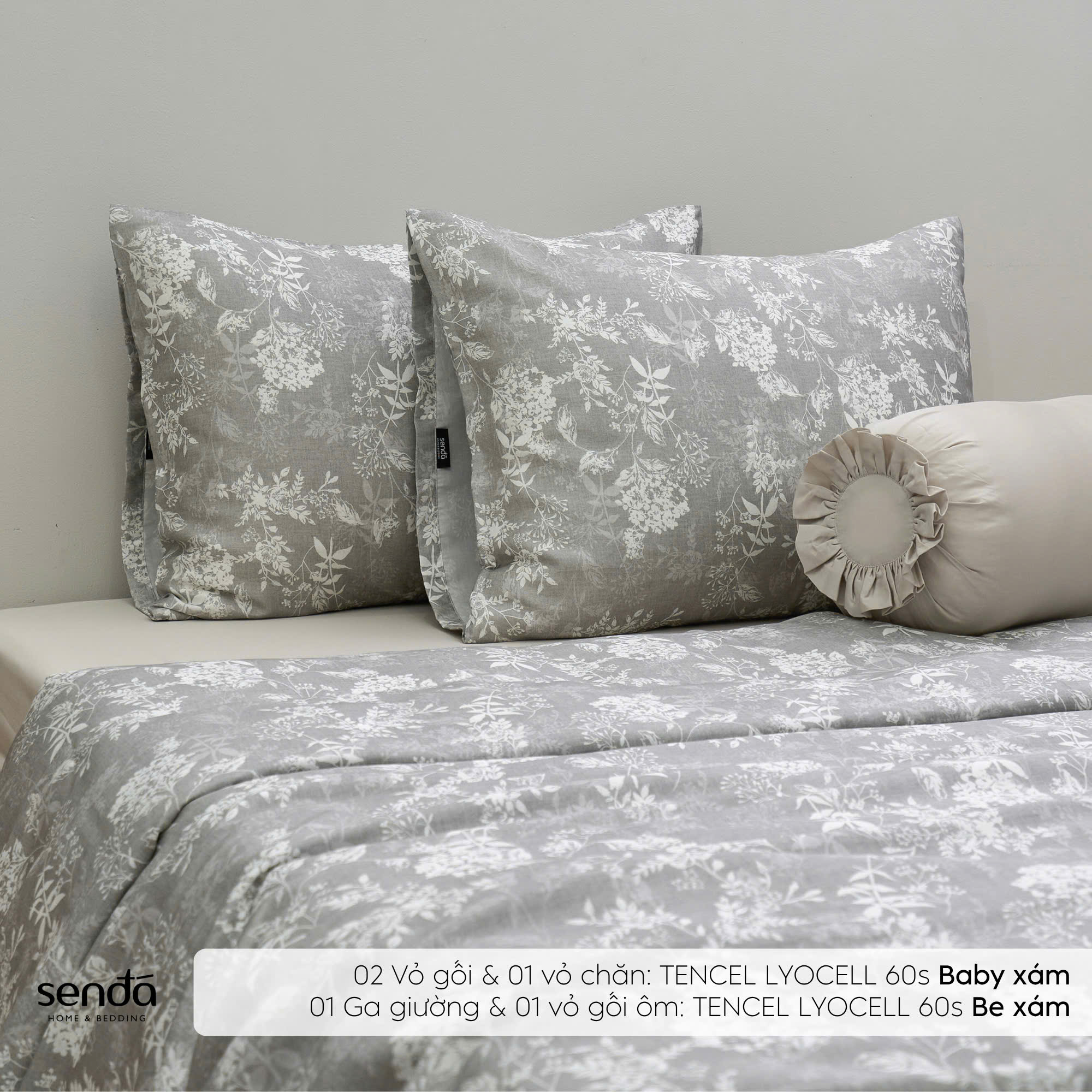 Bộ chăn ga gối 5 món Lụa Tencel 60S họa tiết - Baby xám