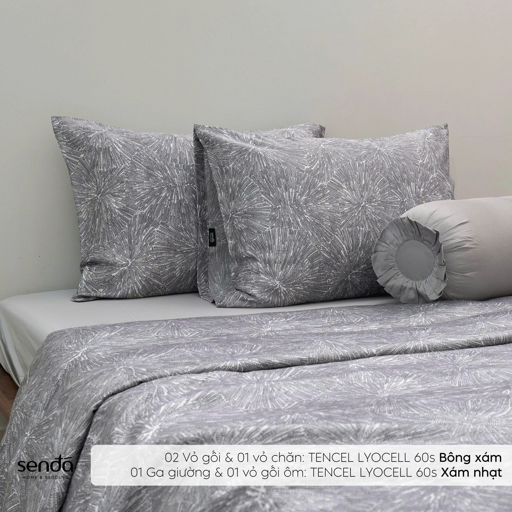 Bộ chăn ga gối 5 món Lụa Tencel 60S họa tiết - Bông xám