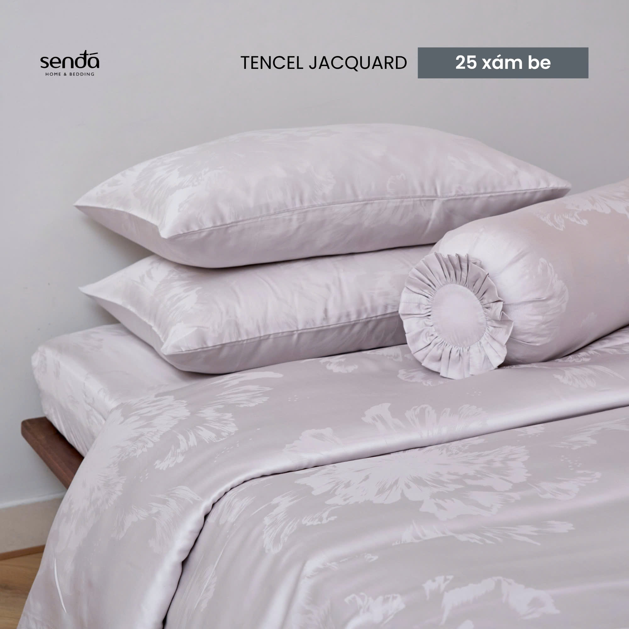 Bộ chăn ga gối 5 món Lụa Tencel Jacquard vân gấm - 25 Xám be