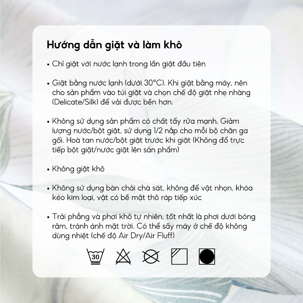 Sản phẩm có thể giặt tay hoặc giặt máy. Nên làm khô sản phẩm tự nhiên bằng cách phơi trong bóng râm, tránh ánh nắng trực tiếp sẽ làm vải bạc màu và khô cứng do mất nước.