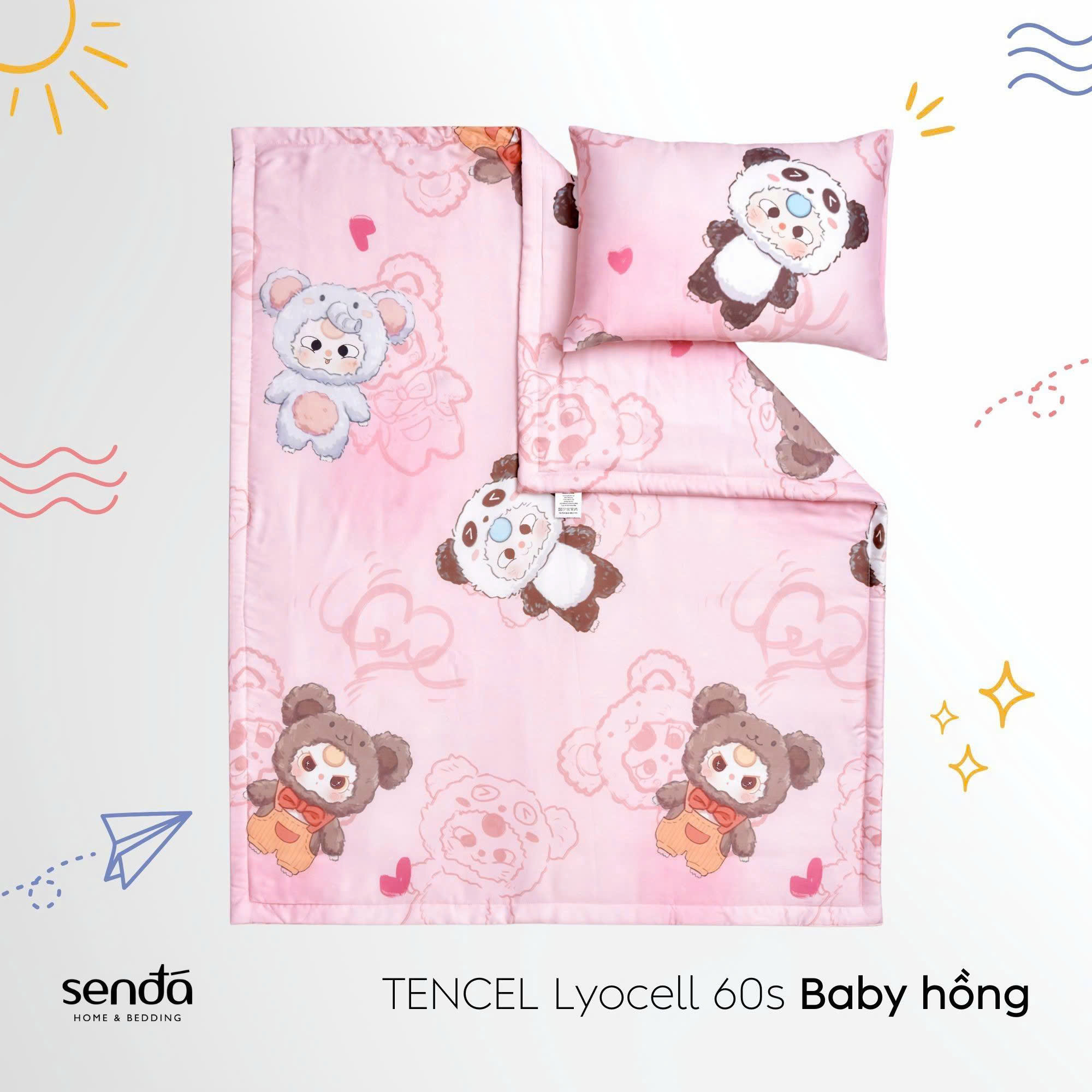 Bộ chăn gối cho bé đi học Lụa Tencel họa tiết - Baby hồng