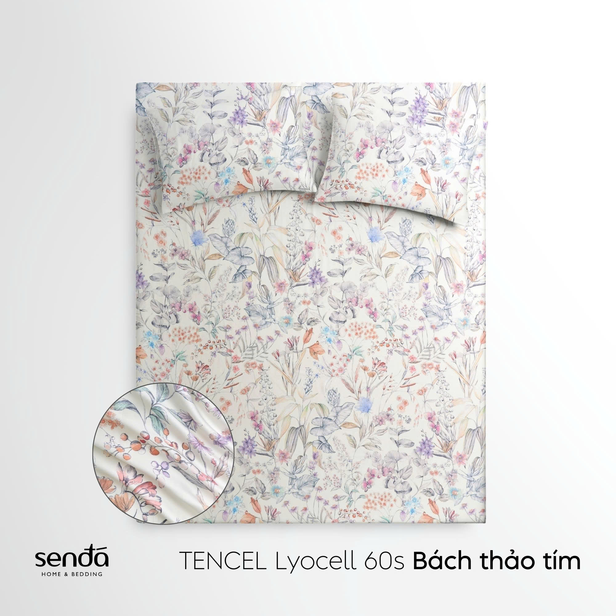 Bộ ga gối 3 món Lụa Tencel 60S họa tiết - Bách thảo tím