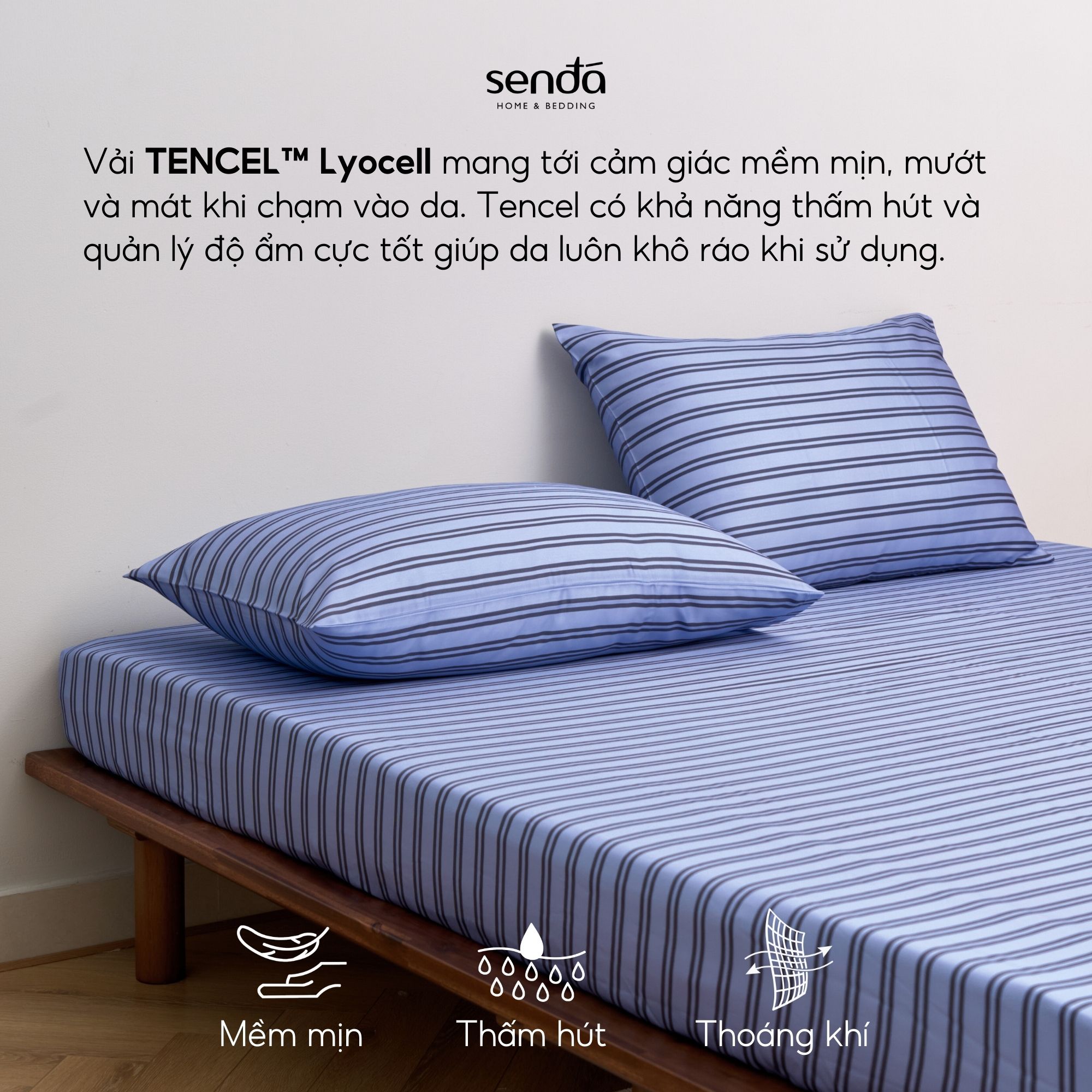 Trên nền chất liệu TENCEL™ cao cấp, bộ sưu tập kẻ sọc mang đến sự mềm mại, thoáng khí và mát lành đặc trưng. Sự kết hợp của họa tiết tối giản và chất liệu thiên nhiên giúp không gian nghỉ ngơi trở nên cân bằng, hiện đại nhưng vẫn giữ được sự ấm áp, gần gũi.