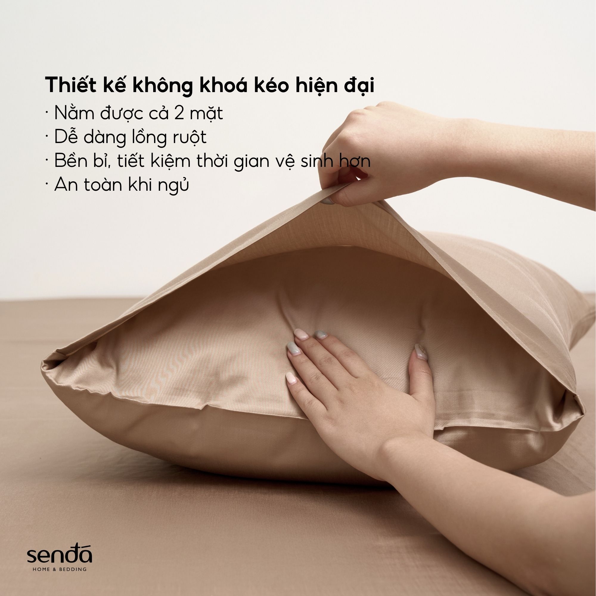 - Vỏ gối nằm 1 lớp vải cửa lồng một bên, thiết kế lồng ruột mà không cần kéo khóa rất tiện lợi, nằm được cả hai mặt, không bị kẹt hay hỏng khóa kéo và an toàn hơn khi ngủ