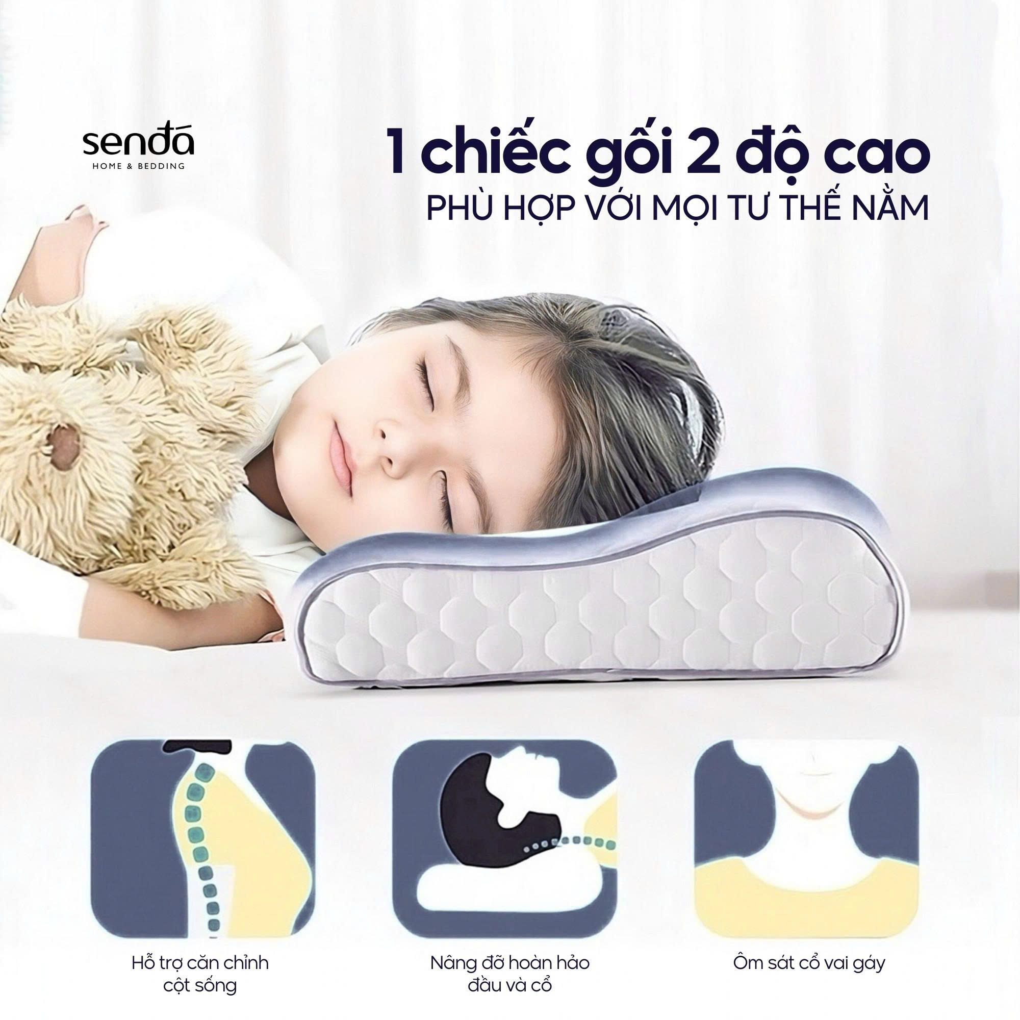 - Hỗ trợ phát triển cột sống tự nhiên cho bé : Thiết kế giúp gối điều chỉnh thích nghi với tư thế ngủ của bé, nâng đỡ phần đầu, đồng thời phân bổ trọng lượng của toàn bộ khu vực cổ và đầu, do đó cột sống cổ sẽ không bị võng xuống, giúp các cơ được thư giãn đúng cách
