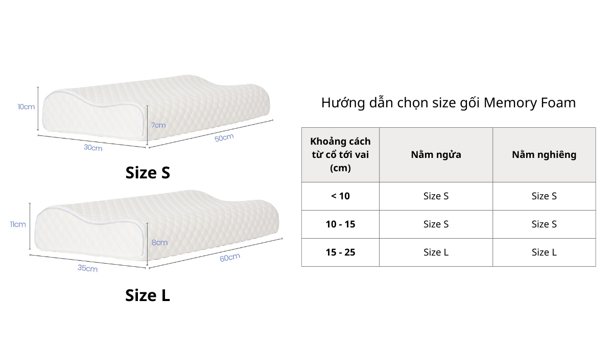 Size S: 50 x 30 x 10/7 cm - Phù hợp với người thích nằm gối thấp, trẻ em hoặc phụ nữ).