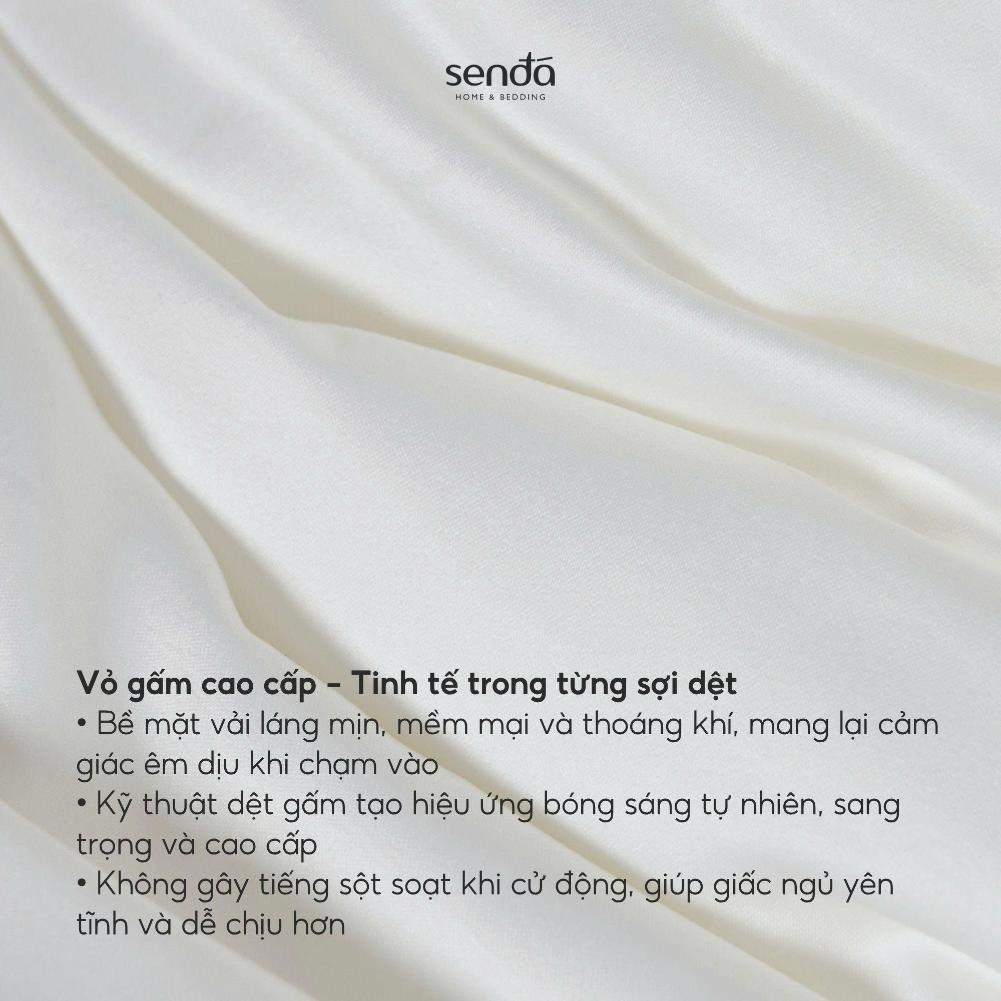 - Lớp vỏ gấm mềm mịn, thoáng khí và bền đẹp, mang sắc trắng tinh khôi cùng ánh gấm nhẹ nhàng, tạo nên nét thanh lịch, sang trọng cho không gian nghỉ ngơi. Bề mặt vải trơn mượt, không gây tiếng ồn khi trở mình giúp giấc ngủ được trọn vẹn.