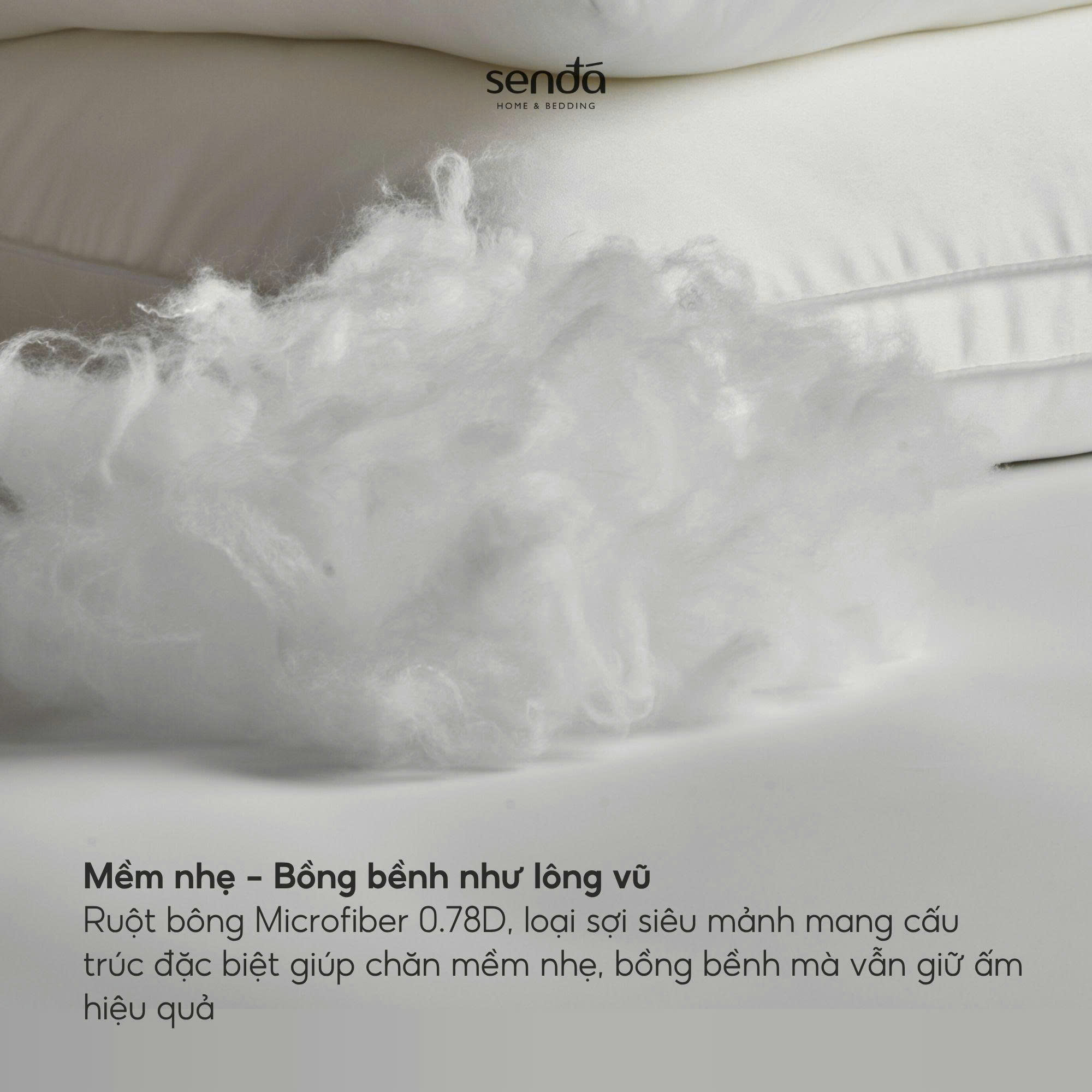 Ruột chăn sử dụng bông Microfiber 0.78D, là loại sợi siêu mảnh có khả năng lưu thông không khí tốt, giúp chăn mềm nhẹ, bồng bềnh như lông vũ, không gây bí nóng khi đắp lâu.