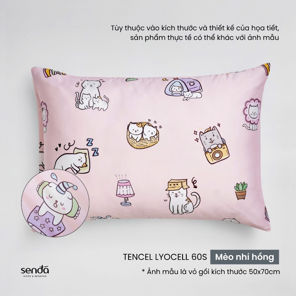 Vỏ gối nằm cho bé đi học Lụa Tencel họa tiết - Mèo nhí hồng